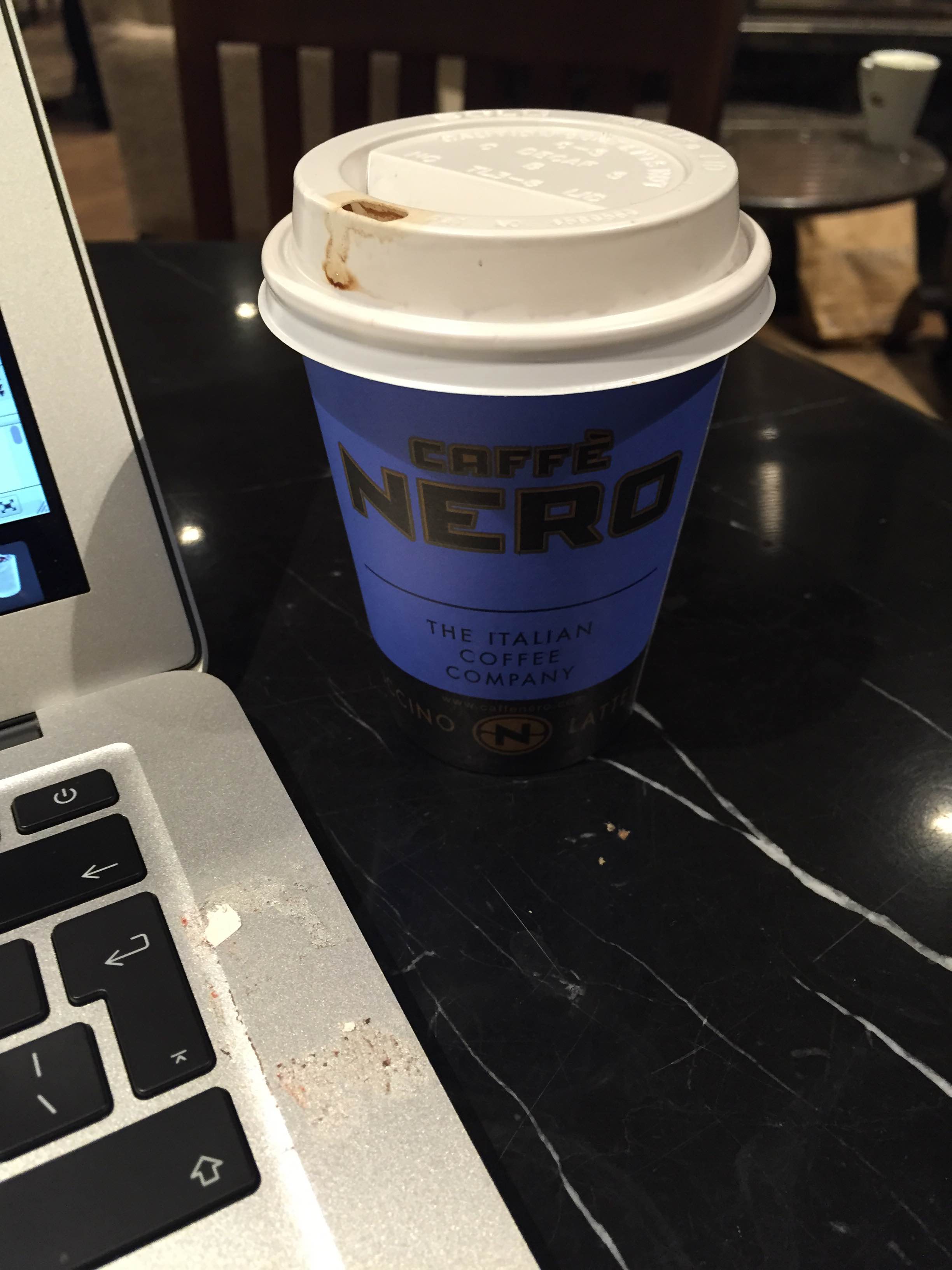 Right now? I’m sat in Cafe Nero on Tottenham Court Road drinking a much less glamorous espresso mocha, from a cup made by a company called ‘Solo Cup Europa’. What a difference a week makes..